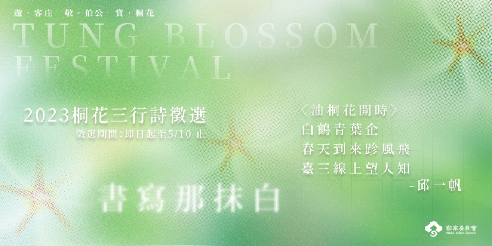 為營造桐花生活美學氛圍,期望大家將心中屬於桐花祭的美好記憶和想像,用創意表現在客家三行詩的文學創作中,透過吟唱三行詩, 展現桐花人文之美。